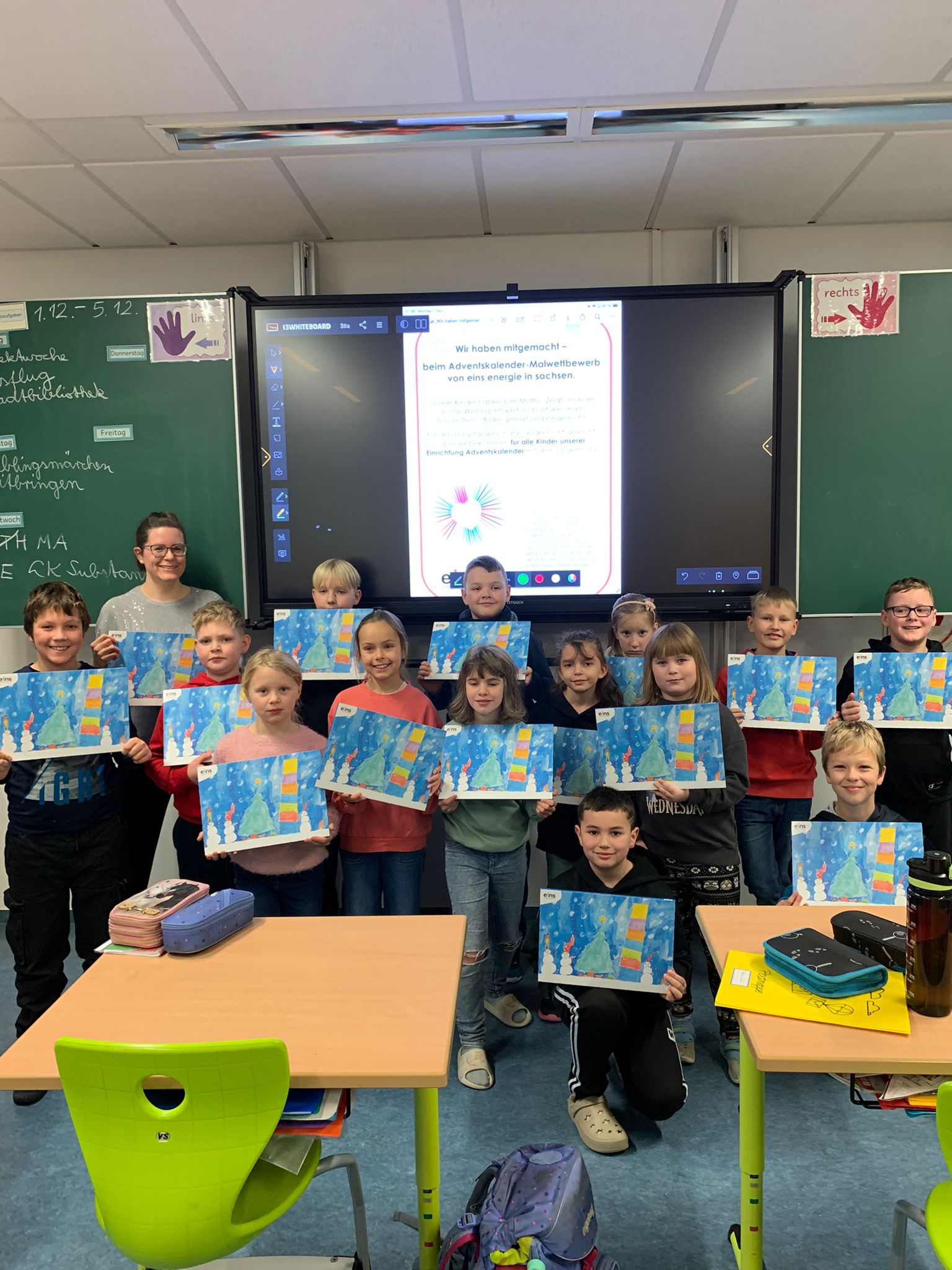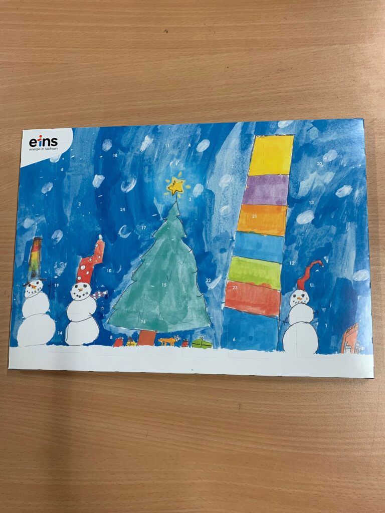 Das ist eine ganz tolle Sache und angesichts der hohen Schokoladenpreise wirklich beachtlich. An dieser Adventskalender-Malwettbewerbsaktion des Chemnitzer Energieunternehmens „Eins Energie in Sachsen GmbH & Co. KG“ nahm auch eine Klasse unserer Grundschule teil.
